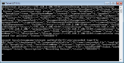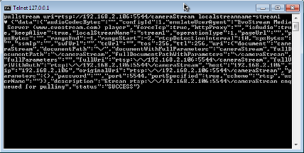 Pull and play an external streamOn the telnet console, send the following command: pullstream uri=rtsp://<RTSP server IP>:<optional port>/<stream> localstreamname=<local stream name> For example, for an RTSP source at 192.168.2.106 and port of 5544 with a stream name of cameraStream: pullstream uri=rtsp://192.168.2.106:5544/cameraStream localstreamname=stream1 ![]() Using any video player (such as VLC), play the stream: rtsp://<EMS server IP>:5544/<local stream name> For example, for an EvoStream Media Server running at 192.168.2.57 and has a local stream name of stream1: rtsp://192.168.2.57:5544/stream1 ![]()
