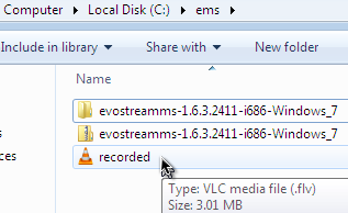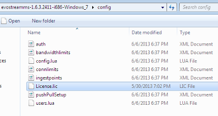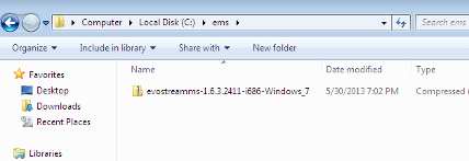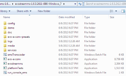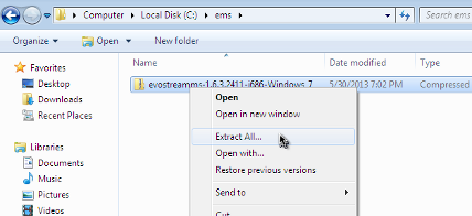 Install EvoStream Media Server2.1 Move/copy to target folder.Locate the downloaded file and copy to the target location (example: C:\ems)![]() 2.2 Right-click on the file and choose "Extract All" (You might need to install either winrar or winzip).![]() 2.3 Double click on the extracted folder.This is normally in the format evostreamms-<version>-<arch>-<os>. For example: evostreamms-1.6.3.2411-i686-Windows_7.![]() 2.4 Copy the downloaded license file to 'config' folder.If you don't have any license file yet, you can get a demo license from here.![]()