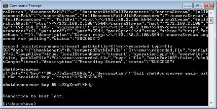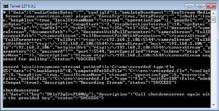 Stop EvoStream Media ServerOn the telnet console, simply send the shutdownserver command. shutdownserver EvoStream Media Server will respond with the key parameter: z{"data":{"key":"Dvix73yZrxP18NJp"},"description":"Call shutdownserver again with the provided key","status":"SUCCESS"}