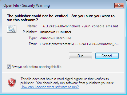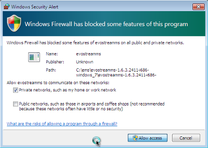 Start EvoStream Media ServerOutside the 'config' folder (main folder), double click on the run_console_ems.bat file to start EvoStream Media Server. If a security warning appears, select 'Run'. ![]() If windows firewall is blocking the ports to be used by EvoStream Media Server, choose 'Allow access'. ![]() The following console depicts a successful EvoStream Media Server start. ![]()