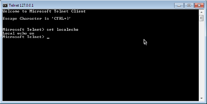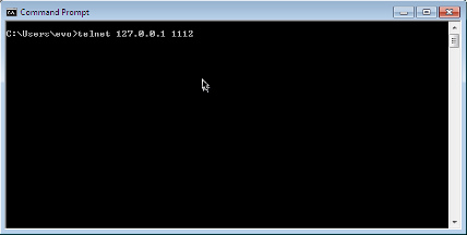 Connect to EvoStream Media Server using telnetOpen another command prompt and type the following: > telnet 127.0.0.1 1112 ![]() A blank screen is normally presented by the telnet console. ![]() Set the local echo by pressing the 'Ctrl + ]' (CTRL key + right square bracket) keys. Then type the following: > set localecho ![]() Press the 'Enter' key twice to go back to the telnet session. ![]()
